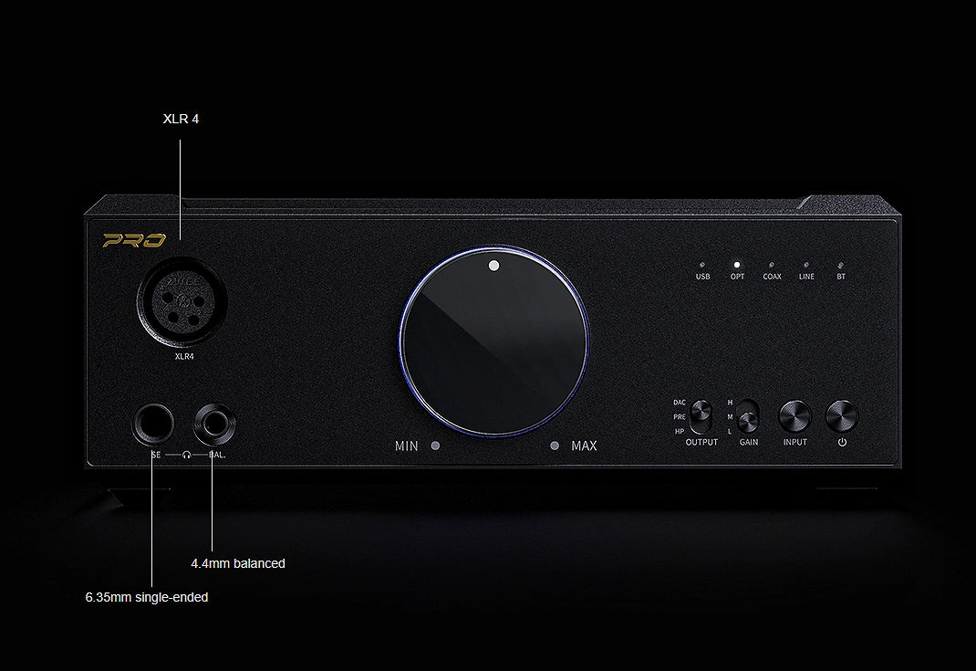 Switch the 5 modes of K9 Pro signal input: USB, OPT: optical fiber, COAX: coaxial, LINE: line output, BT Bluetooth