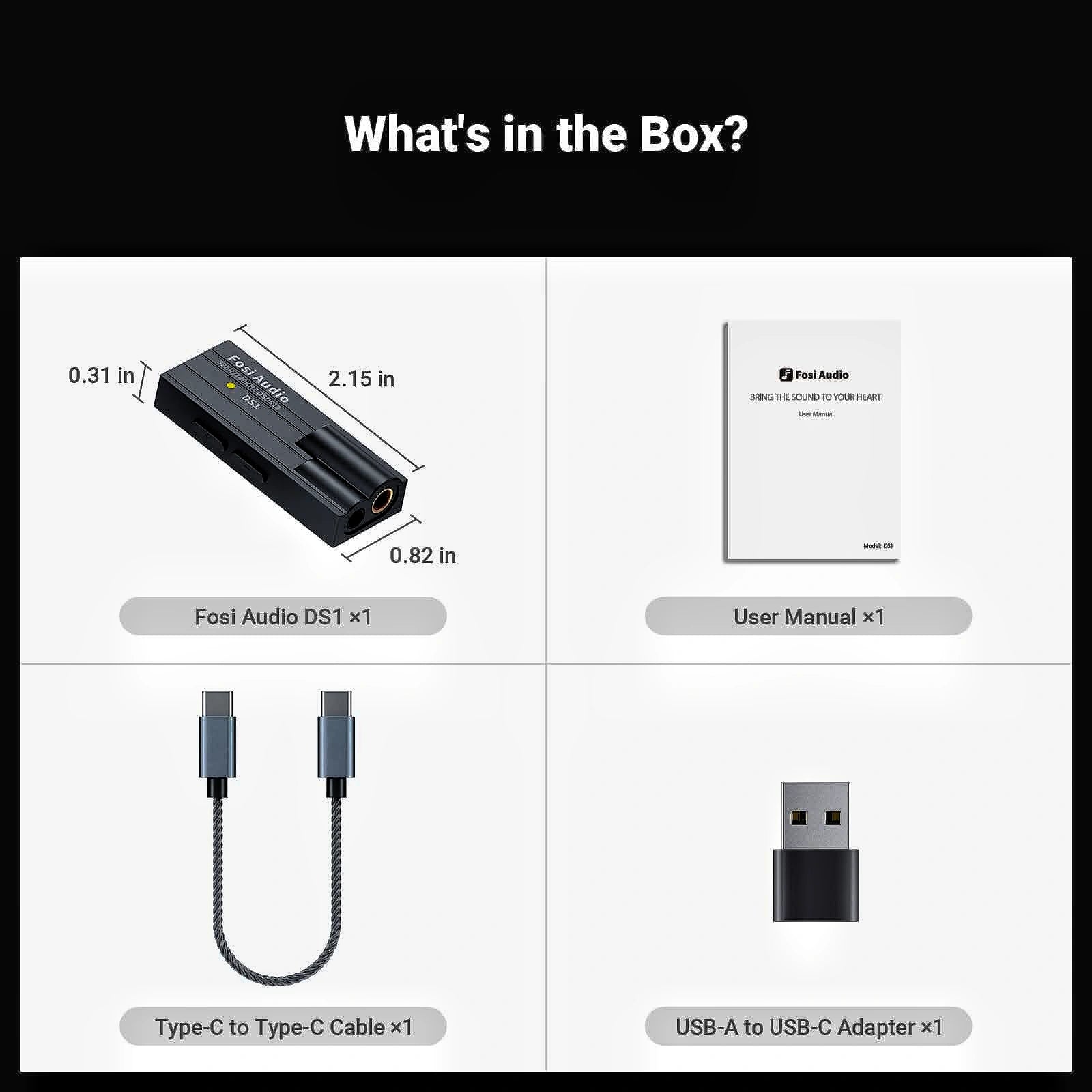 • What You Get: DS1 USB DAC Headphone Amp x1, Type-C to Type-C cable x1, USB-A to USB-C Converter x1, user manual x1, our worry-free 24-month warranty, and friendly customer service. NOTE: The new version of the DS1 headphone amp optimized the volume control which is independently controlled from the audio source device.