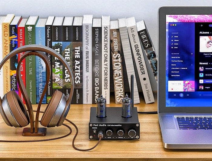 Fosi Audio T20 Bluetooth Tube Amplifier Desktop Headphone Amp & Preamp equipped with OPA1656 op-amp, supporting 16-600Ω headphones. Features RCA input, 3.5mm/6.35mm outputs for versatile... Read more