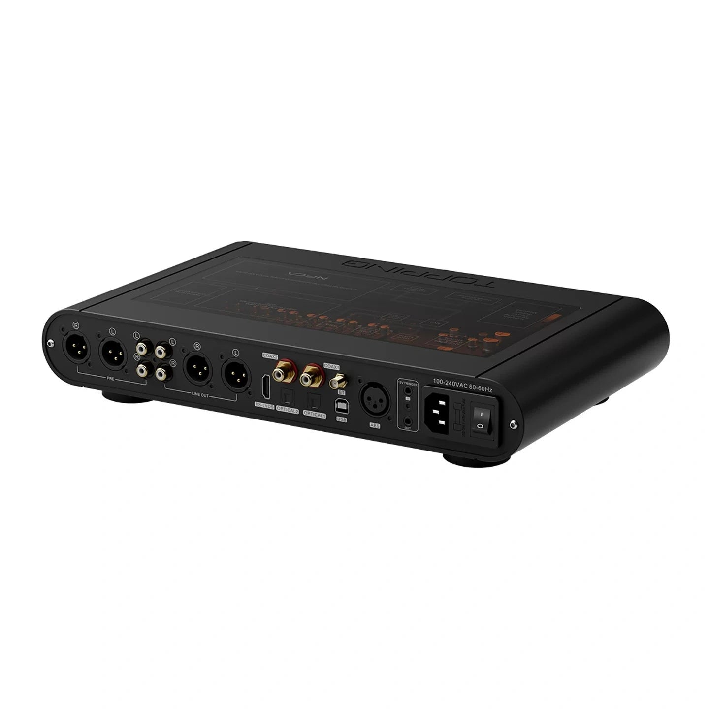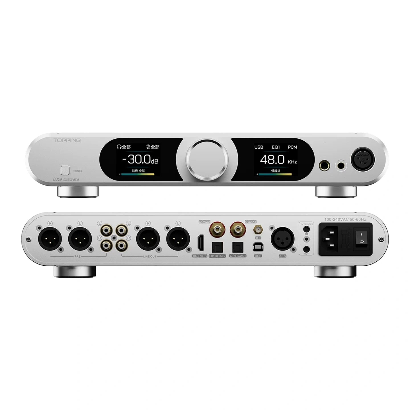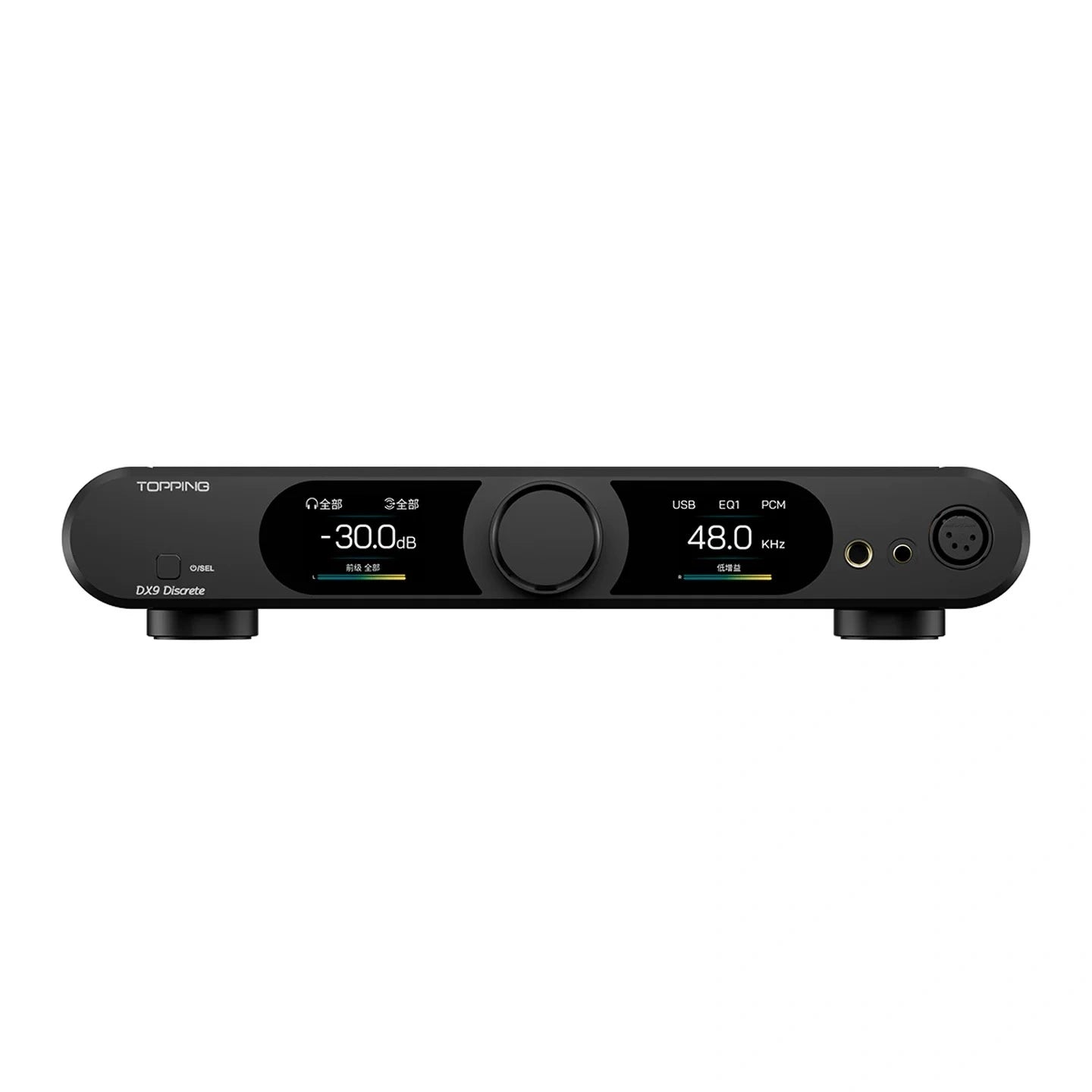 The TOPPING AUDIO DX9 Discrete is ahigh-performance, all-in-one desktopaudio component designed to be thecenterpiece of a sophisticated personaaudio system.lt masterfully combines aDAC(Digital-to-Analog Converter),apreamplifier, and a headphone amplifierinto a single, sleek unit.