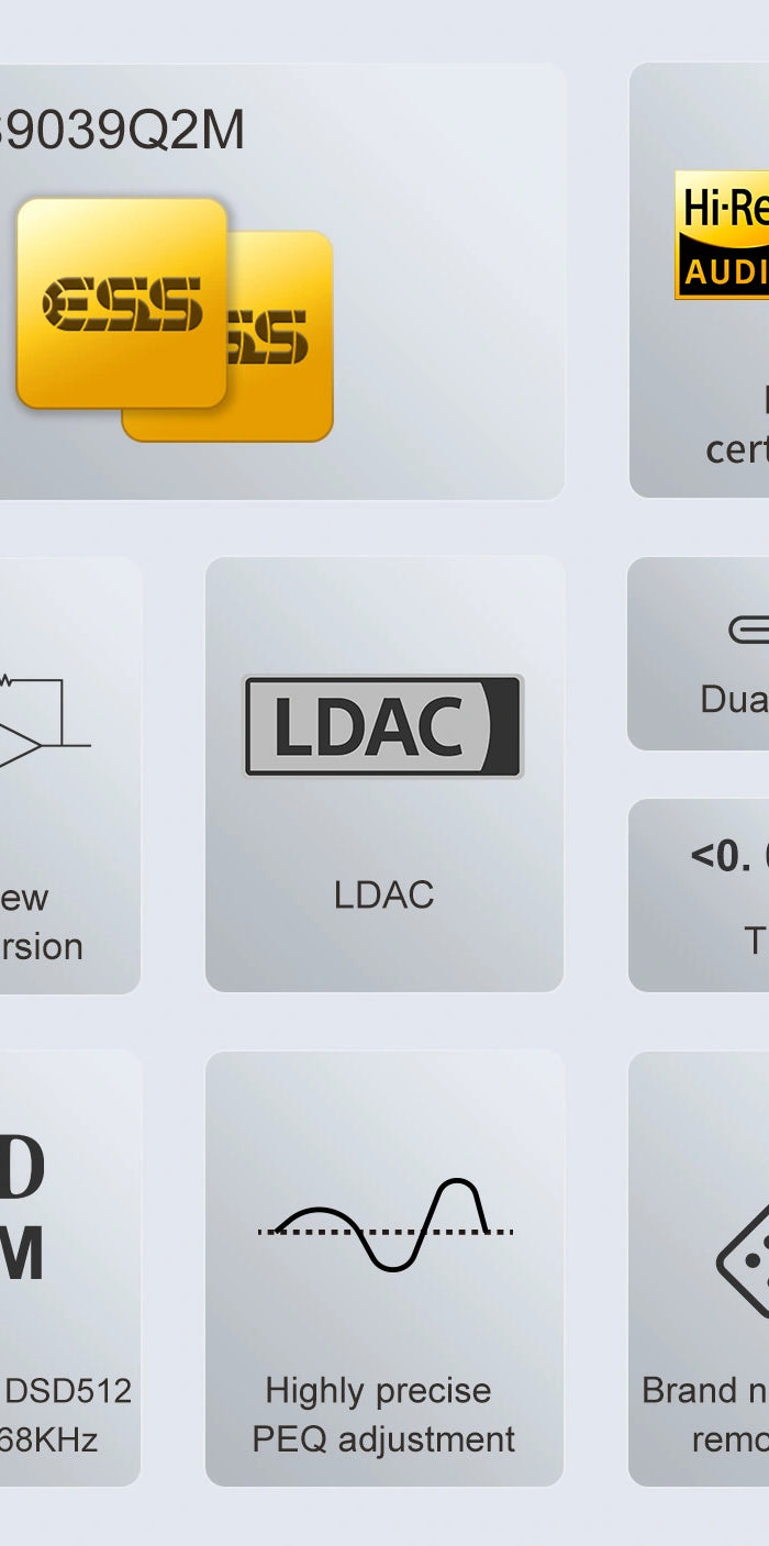 ESS Sabre Reference DAC Chip: Supports up to 32-bit/768kHz PCM and DSD512 native decoding for ultra-high-resolution audio